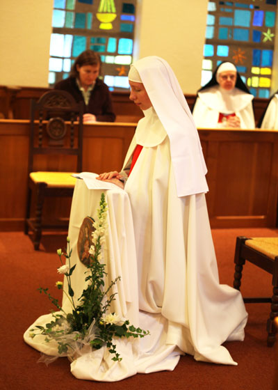 Pour cette étape de sa vie monastique, elle garde le voile blanc des novices. Lors des vœux perpétuels elle recevra le voile noir et la médaille de Sainte Jeanne tenue par un ruban bleu.