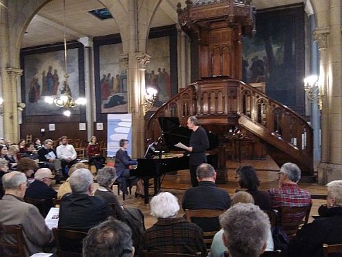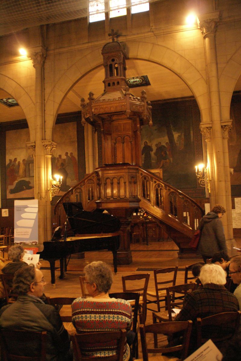 L’église commence à se remplir en de début d’après du dimanche 29 mars. Le piano a été placé au pied de la chaire de laquelle, bientôt,  va s’échapper les