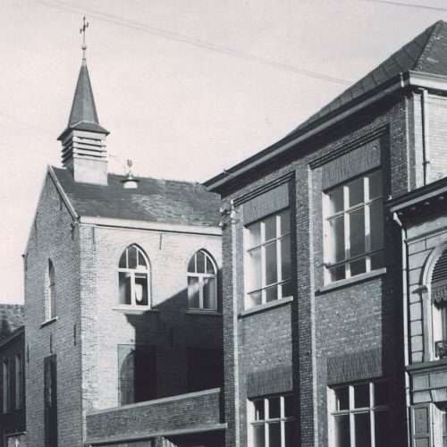 L‘ouverture de cette école a commencé pendant la première guerre mondiale. Entre 1915-1917, la paroisse Sint-Dymfna s’étend de plus en plus. Après la guerre, de par la loi du ministre Jules Destrée, l’enseignement devient obligatoire – ce qui n’était pas le cas avant guerre. Le nombre d’enfants qui ne savent pas lire est grand. Les jeunes filles habitant dans les bourgs éloignés du monastère ne peuvent pas suivre les cours de l’école du monastère, rue Du Pas. Alors, le curé De Vel pense que pour le bien de la paroisse, il doit y avoir une école sur le territoire de Sint-Dymfna. Il prend contact avec l’évêché, le cardinal Mercier, primat de Belgique. Le cardinal se tourne vers les Annonciades de la rue Du Pas et demande aux sœurs d’envoyer à Sint-Dymfna quelques sœurs pour commencer l’école. Sœur Maria Mechtilda, institutrice à l’école du monastère de Geel, va alors avoir la permission du cardinal et de la mère Ancelle d’aller enseigner à Sint-Dymfna. Tous les jours, matin et soir, donc, elle fait le trajet à pied, du monastère à Sint-Dymfna. Le 2 octobre 1917, elle écrit à l’inspecteur de l’enseignement : « Les classes à Sint-Dymfna ont été ouvertes aujourd’hui, 2 octobre. Nous avons commencé très pauvrement avec quelques bancs de l’église, puisque les pupitres de classe ne sont pas encore arrivés. Nous les attendons pour cette semaine…. ». En 1934, il y a 5 classes, avec chacune deux sections.