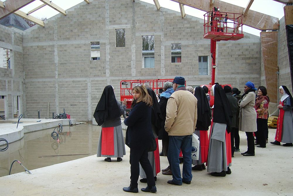 Après avoir dégusté cette fameuse Galette, mère Ancelle a proposé une visite du chantier de la nouvelle chapelle. Proposition accueillie à l’unanimité. Et nous voilà tous partis sur le chantier, suivis de la communauté, découvrant ce que sera bientôt cette nouvelle chapelle. Certains ont eu un coup de cœur pour le petit cloître.