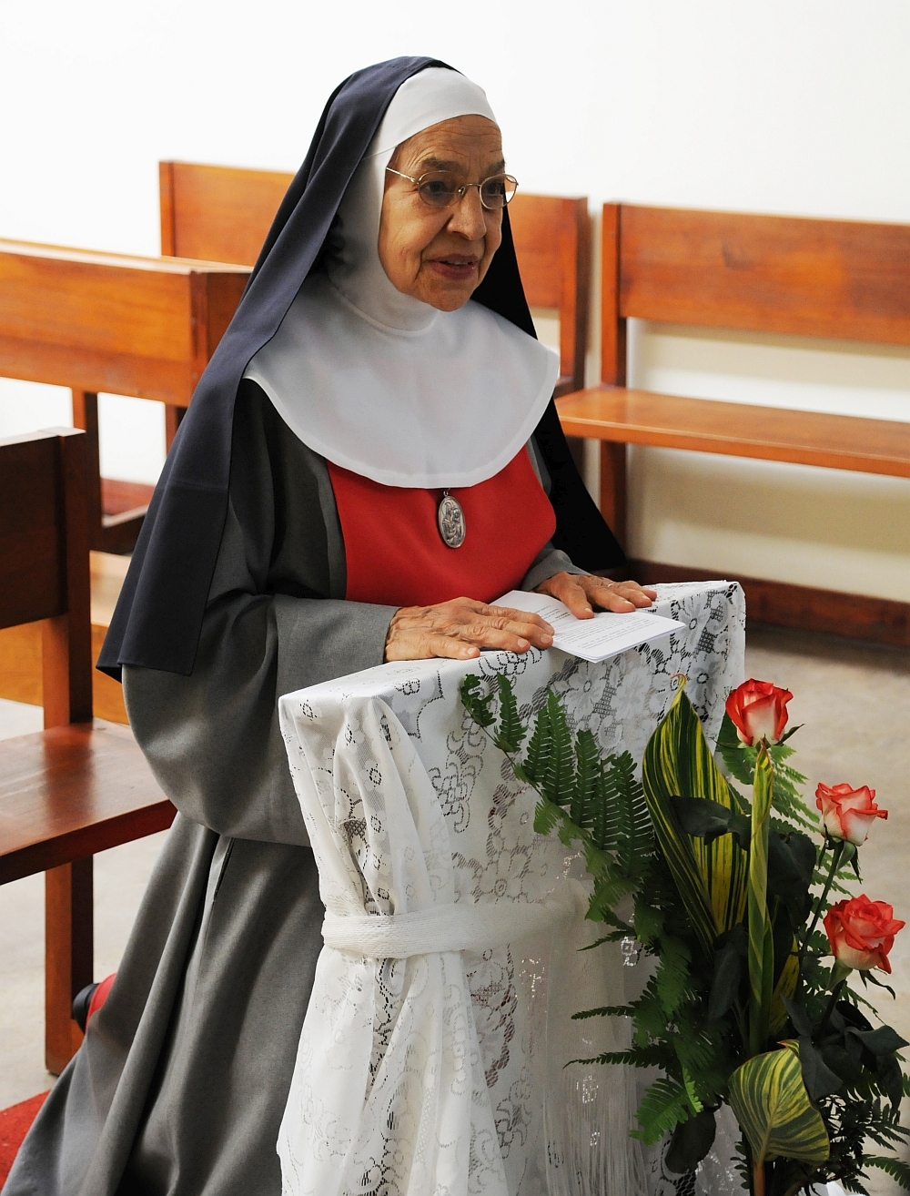La messe du Jubilé était présidée par l’évêque du diocèse, Monseigneur Bartolomé Buigues ; elle fut concélébrée par deux frères Franciscains Jorge et Marco, dont le couvent se trouve près du monastère. La grande famille de soeur Anne-Marie qui est originaire du Costa Rica, et les amis proches de la communauté, vinrent nombreux. Une ombre en ce jour : un vendredi matin, ce n’était pas facile pour ceux qui travaillaient, de venir ; de plus, les routes étaient barrées par des manifestations, ce qui était une chose rare autrefois en ce pays. Un ami du village natal de soeur Anne-Marie, après avoir fait plusieurs tours par la campagne, dut rentrer chez lui.