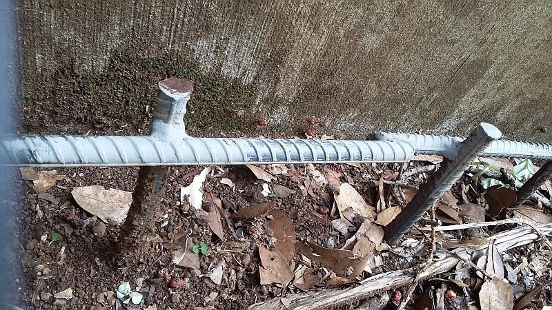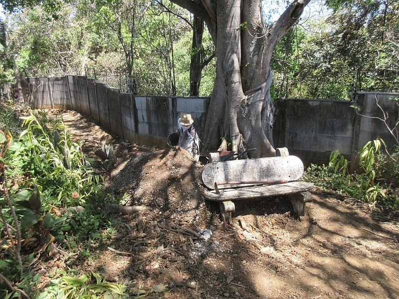 Il a fallu se rendre à l’évidence… le mur commence à se déstabiliser du côté de la rivière, déjà l’une des plaques s’est affaissée.. Avec l’avis des gardes et amis, on a donc planté tout le long des tiges de d’acier qui servent dans le ciment armé, 60 cm de haut tous les 25 cm… soit plus de 100 tringles de 6m de long, soudées entre elles… Mais en creusant bien de l’autre côté, on arrive à les atteindre, à en tordre et dessouder l’une ou l’autre… bref, il a fallu cimenter tout le long…  240 sacs de ciment y sont passés !
