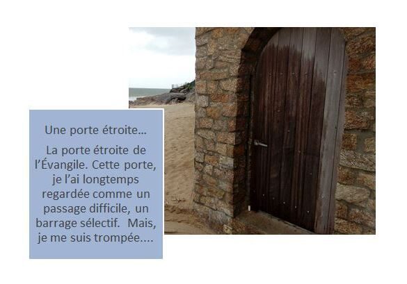 Nous arrivons en ce jour à ce qui me semble être une porte. Une porte étroite. La porte étroite de l’Evangile : « entrez par la porte étroite…, étroite est la porte et resserré le chemin qui mène à la Vie, et il en est peu qui le trouvent. » (Mt 7, 13-14) Cette porte étroite dont parle Jésus, je l’ai longtemps regardée comme un passage difficile, un barrage sélectif tel un examen préparant aux concours de nos grandes écoles françaises. Dans ce cas là on est plutôt tenté par le découragement : « à quoi bon ! C’est trop difficile pour moi ! Je n’y arriverai jamais. » Mais je me suis trompée. Cette porte étroite qui ouvre au royaume infiniment désirable de la vie dans l’intimité de notre Seigneur Jésus Christ et par lui dans le délectable jardin du Dieu Amour Père-Fils et Saint Esprit, c’est l’humilité. Oui, l’humilité. Dire « je suis petit », ce n’est pas encore cela l’humilité. En faire l’expérience, et surtout se réjouir profondément d’expérimenter notre petitesse, voilà je crois le chemin de la petite porte qui alors s’ouvre toute seule, donne joie, paix parce qu’alors notre cœur et tout notre être sont dans la vérité profonde. L’humilité comme un cheminement d’expérience de petitesse en expérience de petitesse, accueillies à chaque fois sans se laisser troubler, sans que la petite flamme de la joie qui brille au fond du cœur ne diminue mais plutôt, qu’elle en soit ravivée.