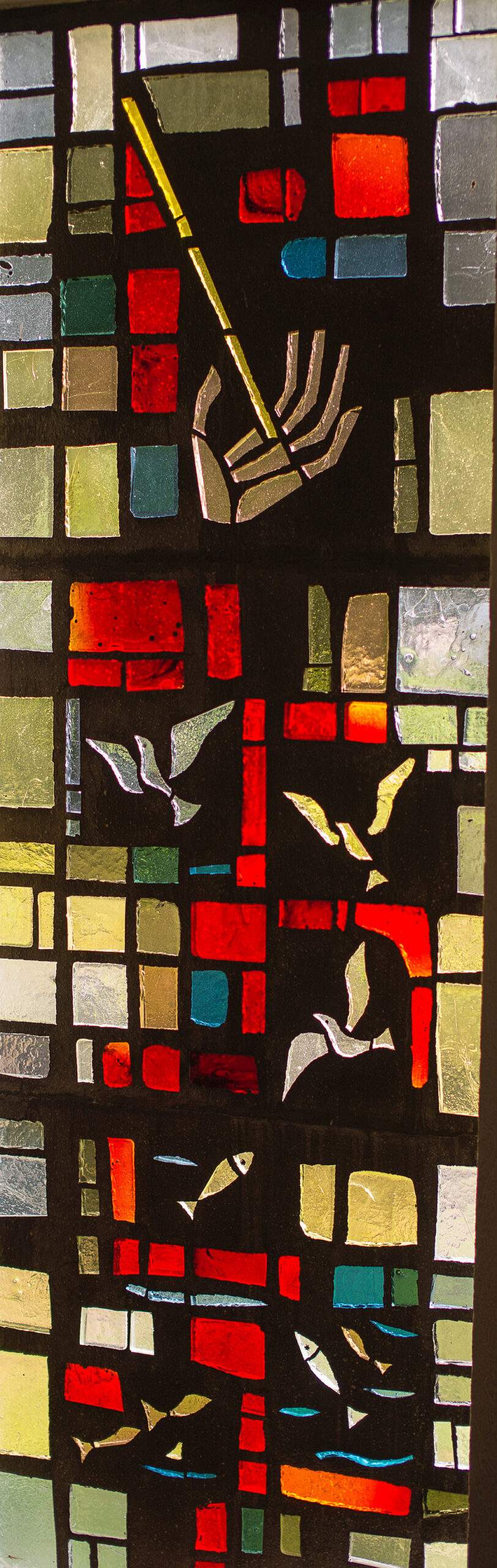 En haut du vitrail, on peut voir une main traversée d’une flèche. Elle évoque l’épisode des Stigmates, le jour où François reçut en son corps les marques de la Passion du Christ.