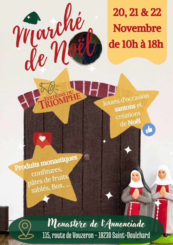 Vente de Noël les 20, 21 et 22 novembre à Saint Doulchard par Monastère de Saint Doulchard | Oct 13, 2025 | Actualités Saint-Doulchard | 0 commentaires Dans la joie de vous revoir ! Articles pouvant vous intéresser Journées d’amitié au monastère de Saint-Doulchard Liturgies de la Semaine Sainte 2025 à Saint-Doulchard BELLE VISITE FRATERNELLE Poster le commentaire Annuler la réponseVotre adresse e-mail ne sera pas publiée. Les champs obligatoires sont indiqués avec *Commentaire * Nom * E-mail * Site web Δ Ce site utilise Akismet pour réduire les indésirables. En savoir plus sur la façon dont les données de vos commentaires sont traitées.