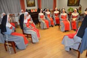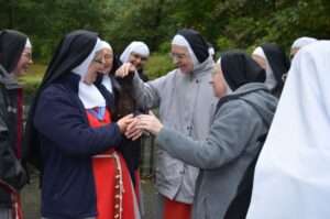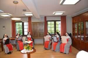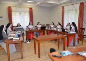 Cette année, la Réunion de l’Ordre a eu lieu dans notre monastère à Grąblin. Les Mères Ancelles et les sœurs Assistantes des monastères de France sont arrivées chez nous le 6 octobre au soir pour neuf jours. Malheureusement, la Mère Ancelle et la sœur Assistante du Costa Rica n’ont pas pu venir en raison de problèmes de santé dans leur communauté. Les échanges se sont donc déroulés avec elles via une connexion internet en ligne, en respectant leur fuseau horaire. Le travail fut essentiellement sur nos Constitutions et la Congrégation religieuse.