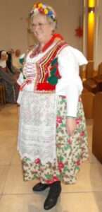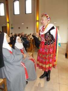 Vêtus de costumes traditionnels étincelants de paillettes et rehaussés de broderies, ornés de rubans et de couronnes de fleurs, parés de colliers brillants, chaussés de bottines de cuir souple, les chanteurs formaient un bel ensemble. Sous la direction de Béatrice Jankowski, notre amie, ils ont tout d’abord déposé une gerbe aux pieds de Marie pour lui confier leur pays d’origine ainsi que l’Ukraine et bien-sûr le concert qui allait se dérouler. Deux instrumentistes les accompagnaient au clavier et au violon.