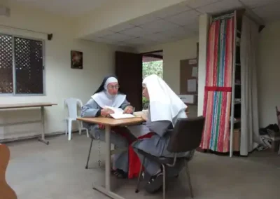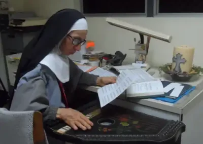 C’est une soeur artiste. En effet, soeur Marie-Blandine dessine. Jeune professe perpétuelle, elle a illustré un livre racontant la vie des saints. Elle aime jouer de la flûte, a une prédilection pour la musique sud-américaine. Est-ce déjà un appel ? Au Bartèu, elle fait des merveilles au jardin, aide au service des hôtes, et s’investie dans l’emploi de liturgiste de la communauté, et de cithariste.