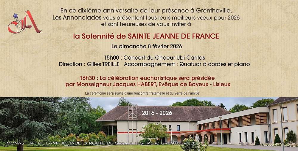 Solennité de Sainte Jeanne de France à grentheville par Grentheville | Jan 16, 2026 | Actualité du Monastère de Grentheville | 0 commentaires Articles pouvant vous intéresser Solennité de Sainte Jeanne de France à Grentheville Les reliques de Sainte Thérèse à Grentheville Solennité de Sainte Jeanne à Grentheville Poster le commentaire Annuler la réponseVotre adresse e-mail ne sera pas publiée. Les champs obligatoires sont indiqués avec *Commentaire * Nom * E-mail * Site web Δ Ce site utilise Akismet pour réduire les indésirables. En savoir plus sur la façon dont les données de vos commentaires sont traitées.