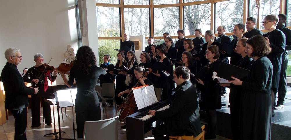 L’entrée des artistes est impressionnante : les instruments à corde accompagnent l’arrivée des chanteurs, créant une intense atmosphère de silence et de recueillement ! Aucun applaudissement ne vient troubler ce moment suspendu. Puis les pièces chantées, accompagnées au piano et aux instruments à corde, se succèdent sans interruption et dans ce même climat intérieur. Les feuillets distribués permettent aux spectateurs de suivre les paroles des chants. Les applaudissements enfin éclatent, soutenus, après le canon repris par l’assemblée. Nous venons de vivre un moment unique et merveilleux ! « Rien que du bonheur », dira l’une des choristes, sentiment partagé par tous. L’acoustique de la chapelle rend les chants plus envoûtants. Gille Treille, qui dirige cet ensemble, a atteint pleinement son objectif et créé la magie de cette journée.